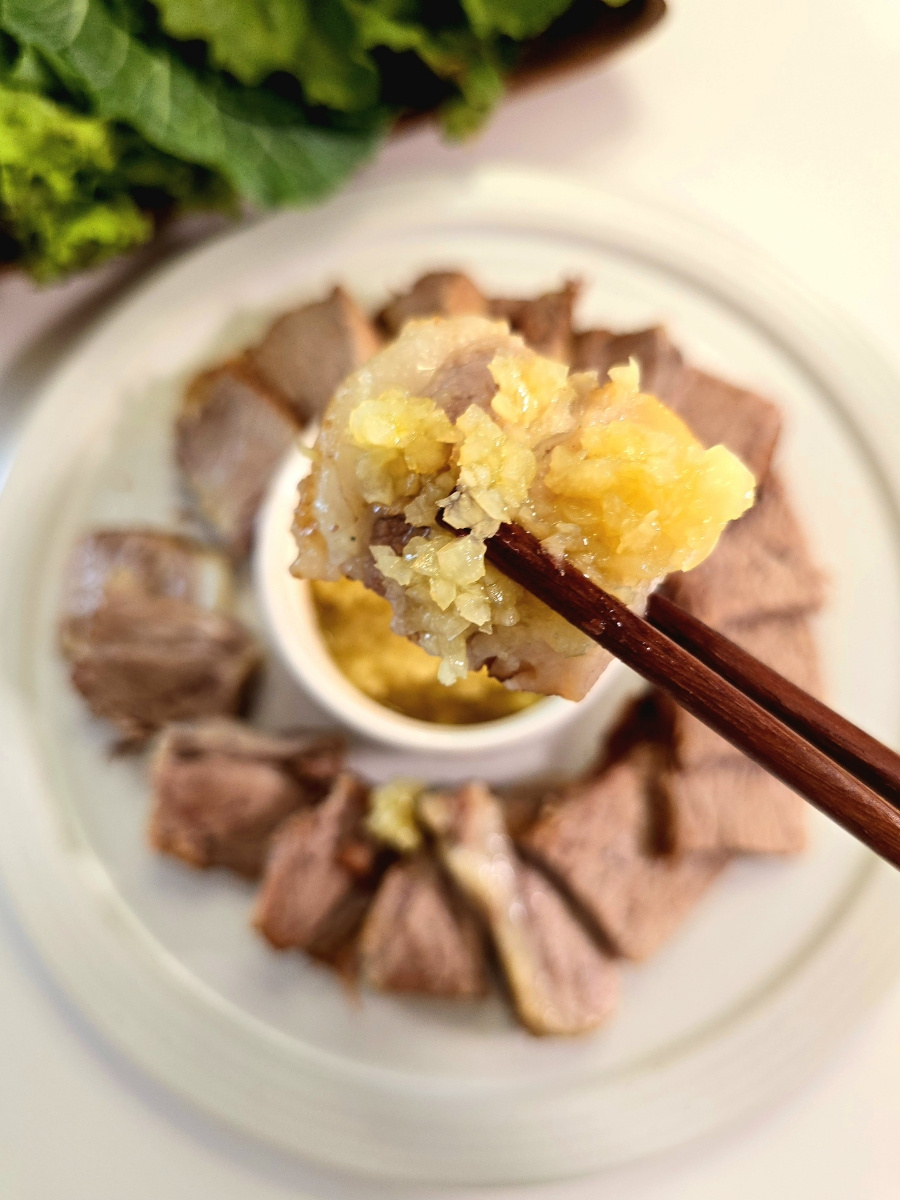 Cara Mudah Merebus Daging Babi (Suyuk) di Panci Nasi Elektrik dengan Saus Bawang Putih Spesial