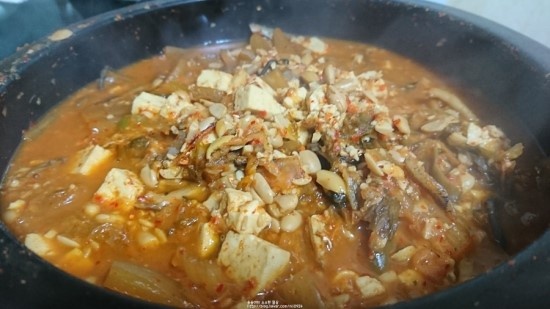 Dalam panci tanah liat Korea tradisional (ttukbaegi) atau panci biasa, campurkan Cheonggukjang, kimchi cincang, cabai cincang, dan tahu potong dadu. Tambahkan bawang putih cincang.