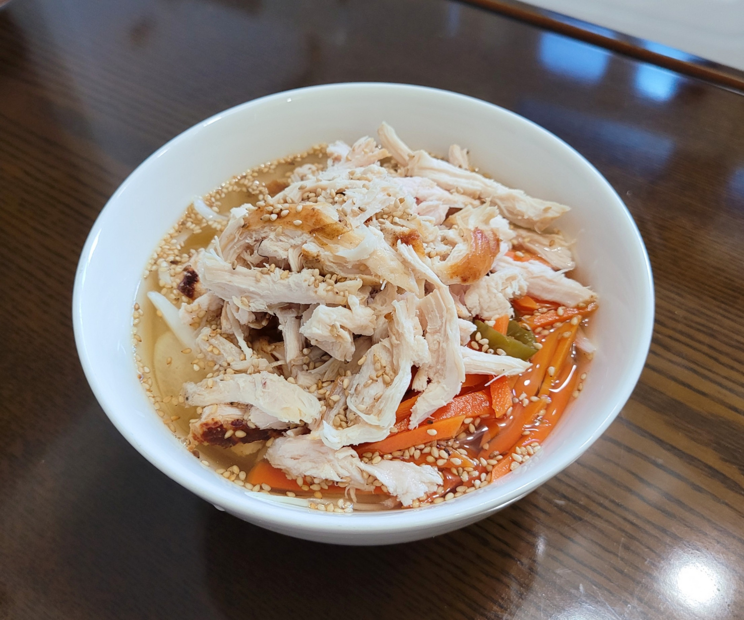 Sajikan somyeon yang sudah disiapkan di dalam mangkuk, tuangkan kuah dingin yang melimpah, dan beri topping suwiran dada ayam. Terakhir, taburkan biji wijen secukupnya untuk tampilan yang cantik. Chogye Guksu buatan rumah Anda yang segar dan lezat sudah siap! Selamat menikmati!