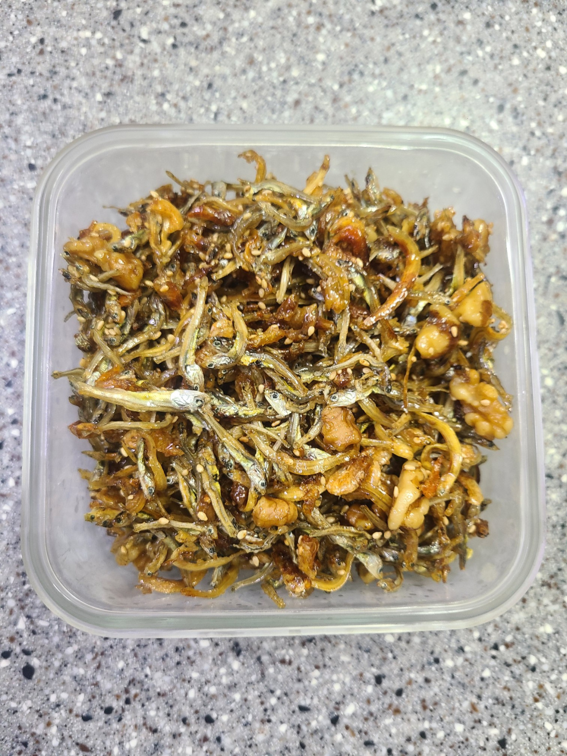 Masukkan kembali ikan teri, silchi, dan udang kering yang sudah digoreng ke dalam wajan. Campurkan dengan baik dengan saus gula yang sudah larut. Selanjutnya, tambahkan kacang kenari dan oligodang (sirup jagung) untuk menambah kilau dan rasa manis, aduk sebentar lagi. Matikan api, lalu akhiri dengan menambahkan minyak wijen dan biji wijen, aduk rata. Ikan teri goreng renyah dan kenyal ala gangjeong Anda siap! Akan menjadi lebih renyah saat dingin, jadi biarkan dingin sepenuhnya sebelum disajikan.