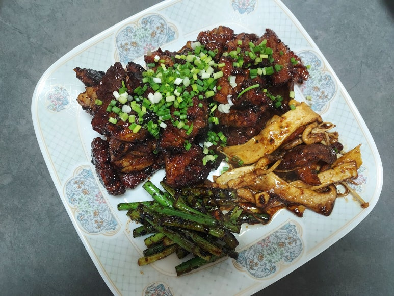 Panaskan sedikit minyak di wajan. Masukkan daging punggung babi yang sudah dimarinasi dan masak dengan api sedang atau sedang-kecil. Perhatikan suhu agar bumbu tidak gosong. Saat daging sudah sekitar 80% matang, masukkan jamur tiram king, batang daun bawang putih (atau irisan bawang putih), dan masak bersama hingga matang. Setelah matang sempurna, potong daging menjadi ukuran sekali gigit (sekitar 3-4 cm).