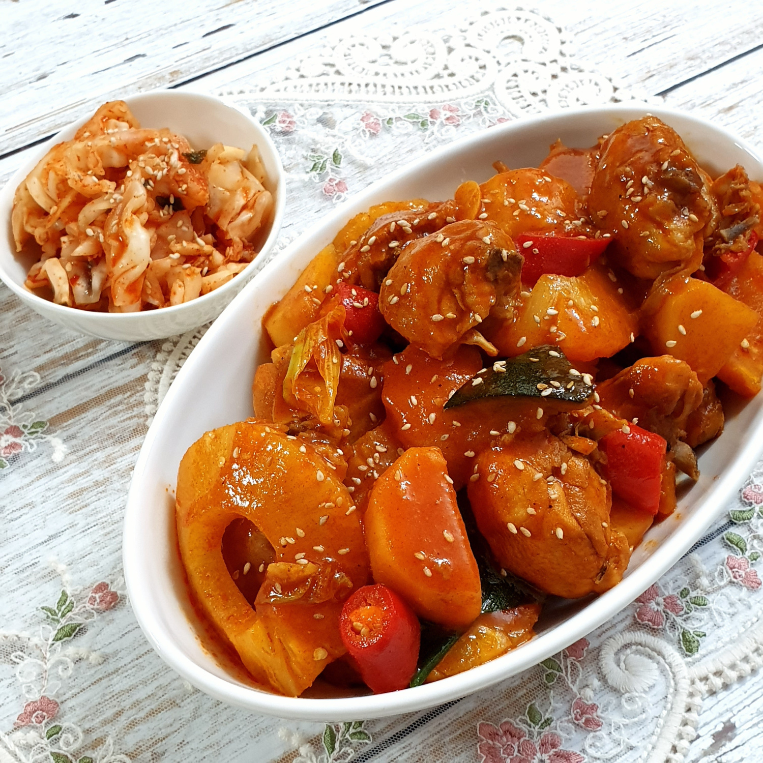 Dakbokkeumtang Kari dan Kimchi Kubis yang segar kini siap disajikan! Aroma yang menggoda dan tampilan yang menggiurkan pasti akan membuat waktu makan Anda lebih menyenangkan.