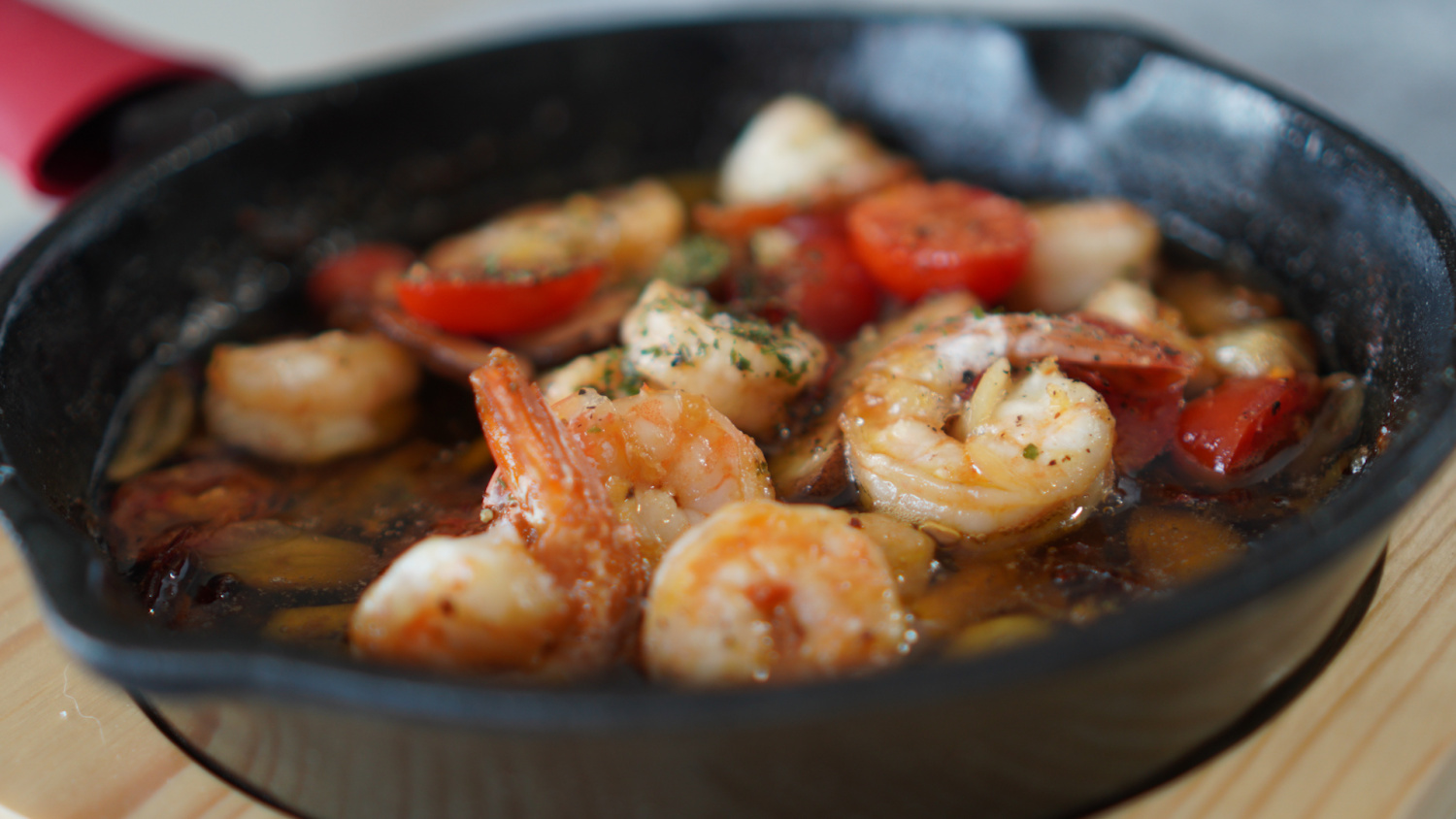 Ketika udang berubah warna menjadi merah muda dan setengah matang, tambahkan tomat ceri yang dibelah dan jamur shiitake yang diiris. Tumis semuanya hingga sayuran melunak dan menyerap minyak bawang putih dan udang yang lezat.