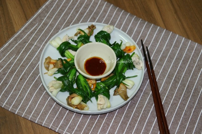 Dan inilah dia – hidangan jamur tiram berbumbu yang lezat! Ini bisa dinikmati begitu saja sebagai banchan (lauk) yang beraroma. Rasanya yang gurih akan melengkapi gulungan daun bawang dengan indah.