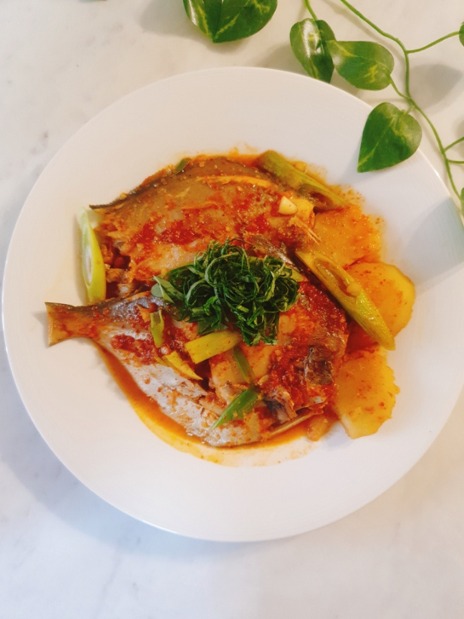 Meskipun ikan bumbu biasanya menggunakan lobak, ibu mertua saya selalu mengatakan bahwa membumbui ikan bawal dengan kentang lebih lezat, sebuah metode yang telah dia gunakan sejak masa pengantin barunya. Itulah mengapa saya selalu menambahkan kentang saat membuat hidangan ini; rasa gurih kentang melengkapi ikan dengan indah. Dibumbui hingga sausnya kental dan hampir kering dengan rasa pedas yang menggigit, hidangan ini menjadi santapan yang luar biasa sederhana namun memuaskan yang berpasangan sempurna dengan nasi.