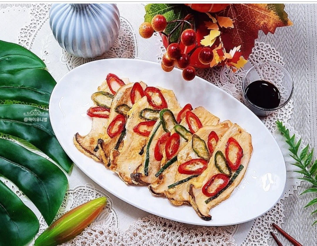 Memperkenalkan jeon (pancake Korea) yang sehat dan lezat terbuat dari jamur tiram raja, yang terkenal dengan teksturnya yang kenyal dan rasanya yang kaya. Jamur tiram raja rendah kalori, menjadikannya hidangan yang bebas rasa bersalah dan sering menjadi pilihan dalam daftar belanjaan. Hari ini, kami telah mengubah jamur segar ini dengan melapisi mereka dalam adonan telur dan menggorengnya hingga berwarna keemasan dan sangat gurih. Kami bahkan menambahkan garnish cabai berwarna-warni untuk membuatnya lebih menarik secara visual. Saat disajikan sebagai jeon, kekenyalan dan kelembaban khas jamur tiram raja semakin terasa, membuatnya lebih nikmat. Cita rasanya yang sederhana namun mendalam menjadikan hidangan ini pendamping yang sangat baik untuk nasi atau teman minum yang berkelas.