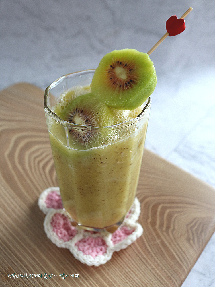 Hias jus kiwi yang sudah jadi dengan irisan kiwi tipis untuk sentuhan visual tambahan. Anda bisa menikmatinya sebagai jus kiwi dasar dengan memblender sedikit air atau es, atau mengubahnya menjadi ‘kiwi spritzer’ yang menyegarkan dengan memblendernya dengan minuman soda rasa lemon-lime.
