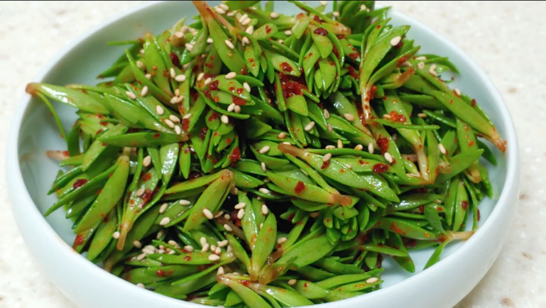 Tambahkan sedum yang sudah ditiriskan (100g) dengan lembut ke dalam mangkuk berisi bumbu. Sedum sangat rapuh dan mudah memar, jadi tangani dengan hati-hati.