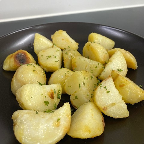 Setelah matang, potong kentang menjadi ukuran sekali gigit, sekitar 4cm diameter. Lelehkan 20g mentega di wajan dengan api sedang-kecil. Masukkan potongan kentang dan panggang perlahan hingga permukaannya berwarna kecoklatan dan menyerap aroma mentega. Memanggang hingga bagian luarnya sedikit renyah adalah kunci utamanya.