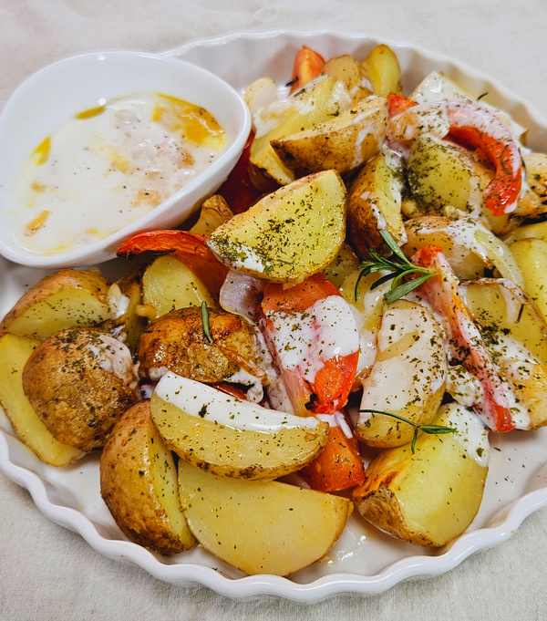 Saat pagi yang panas dan nafsu makan menurun, coba hidangan kentang panggang oven ini! Kami menambahkan kecap ikan untuk memberikan nuansa seperti saus Caesar, melengkapi kentang, tomat, dan bawang bombay yang dipanggang. Sentuhan kecap ikan dalam saus yogurt menciptakan rasa gurih dan asin yang berpadu indah dengan kentang. Saya sering membuat yogurt sendiri untuk salad, tetapi ini juga fantastis sebagai saus kentang. Ini adalah cara yang lezat untuk menikmati hidangan pendamping!