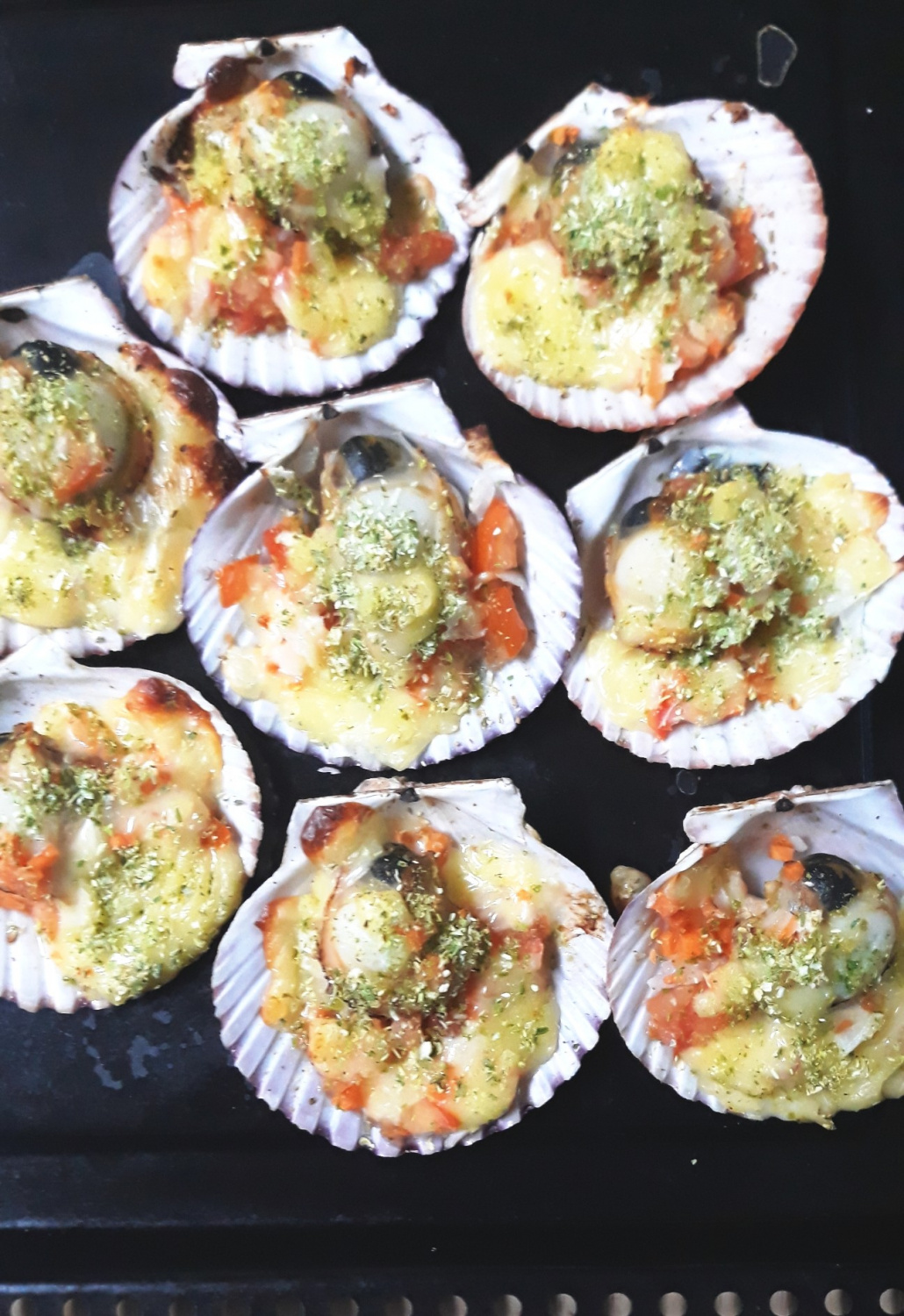 Scallop panggang dengan keju leleh, sayuran segar, dan sedikit rasa pedas yang menggugah selera.