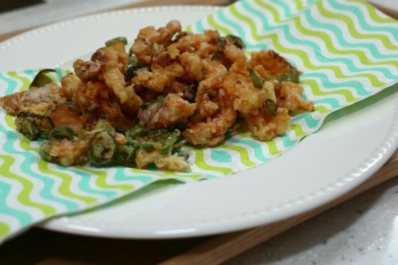 Dalam mangkuk besar, masukkan 1 cangkir tepung adonan goreng. (Untuk tekstur yang lebih renyah, Anda bisa menggunakan tepung tempura, atau campuran tepung adonan goreng dan tepung tempura).