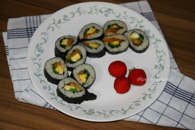 Susun strip chwinamul, kimchi, dan omelet telur yang sudah disiapkan secara merata di atas nasi. (Foto untuk langkah ini hilang.) Mulai dari tepi bawah, gulung gim ke atas dengan lembut, tekan dengan kuat untuk mengamankan isian. Setelah digulung, tekan bagian sambungan untuk menyegel kimbap dengan rapat.
