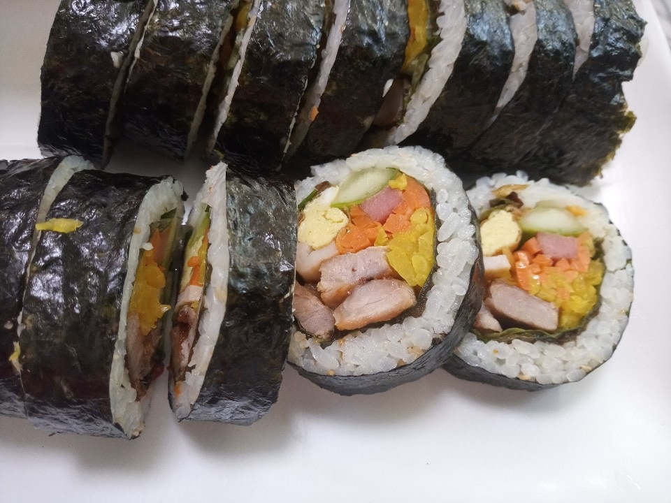 Variasi lain: Letakkan daun perilla acar di atas rumput laut terlebih dahulu, lalu tambahkan bahan lainnya dan gulung. Untuk kimbap dengan perut babi, sedikit ssamjang akan sangat meningkatkan rasa. Secara pribadi, saya menemukan kombinasi perut babi dan daun perilla acar sangat lezat. Saat menggunakan daun perilla acar, disarankan untuk menyesuaikan jumlah acar lobak.