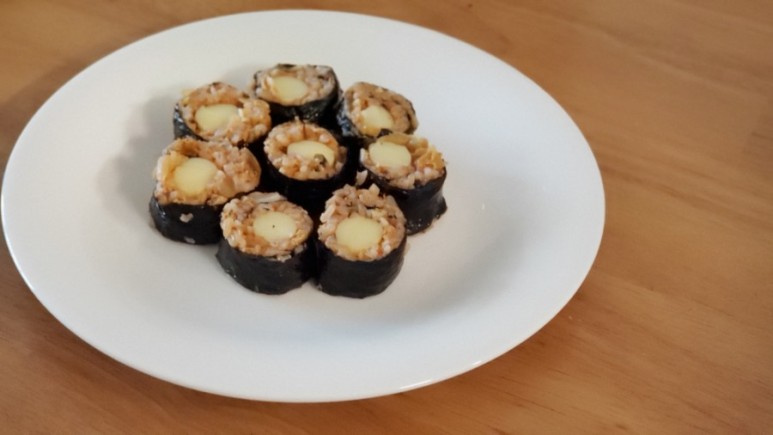 Sebarkan nasi goreng kimchi tuna yang sudah disiapkan tipis-tipis di atas lembaran rumput laut. Letakkan sebatang keju batang di tengahnya. Gulung kimbap dengan kencang untuk menyelesaikan kimbap gaya Shinjeon, nikmati kombinasi fantastis dari nasi goreng kimchi pedas dan keju yang meleleh! Bahkan jika Anda belum terbiasa menggulung kimbap, keju batang membuatnya mudah!