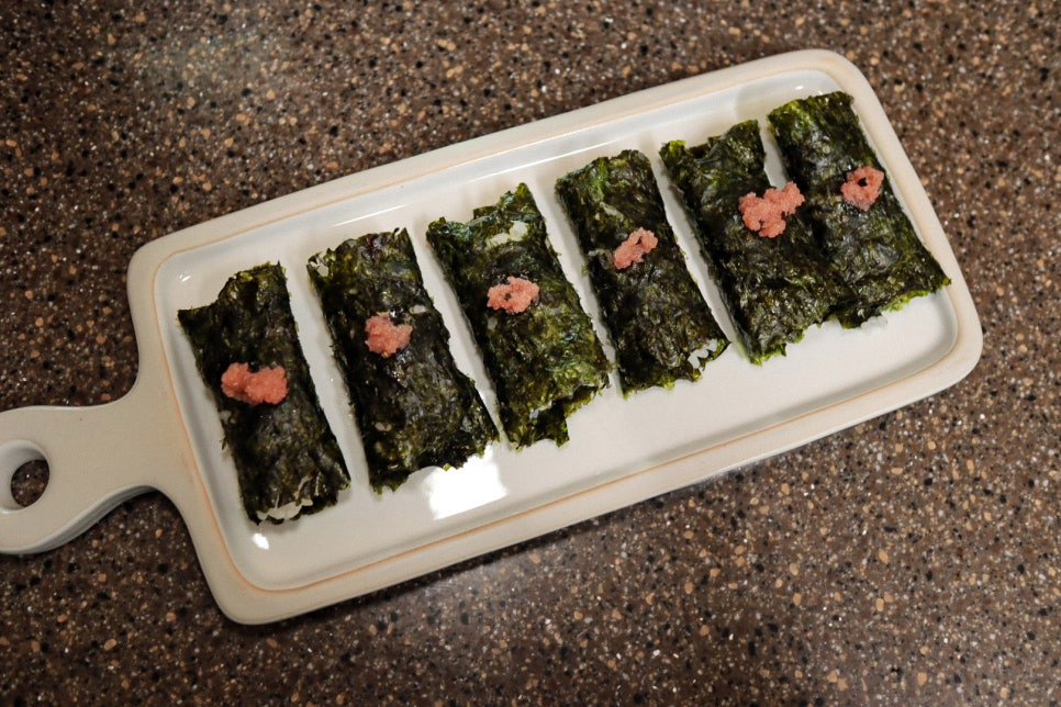 Siapkan lembaran rumput laut panggang tanpa garam (Mugami Gim). Lembaran ini tidak mengandung garam, sehingga rasa gurih alami dari telur ikan pollack dapat bersinar dan menciptakan profil rasa yang lebih harmonis.