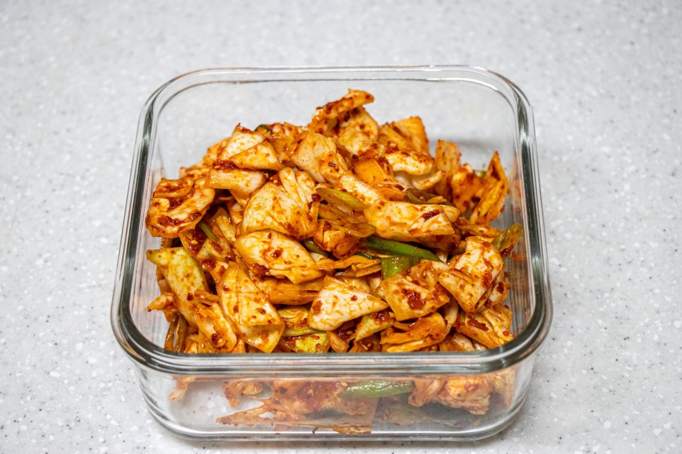 Terakhir, iris tipis daun bawang secara menyerong. Tambahkan irisan daun bawang ke dalam kimchi kol dan aduk ringan sekali lagi. Rasa sedikit pedas dan aroma daun bawang akan semakin meningkatkan cita rasa kimchi secara keseluruhan.