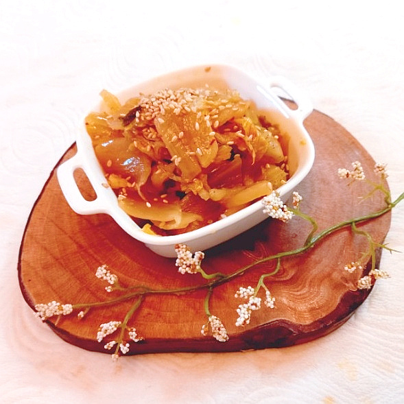 Dan inilah dia! Kimchi tumis yang lezat, harum dengan minyak perilla, siap disajikan. Tidak pedas, menjadikannya lauk yang bagus untuk anak-anak, dan sempurna untuk dicampur dengan nasi hangat untuk makanan yang memuaskan. Ini pasti akan menjadi tambahan yang populer untuk bekal suami Anda!