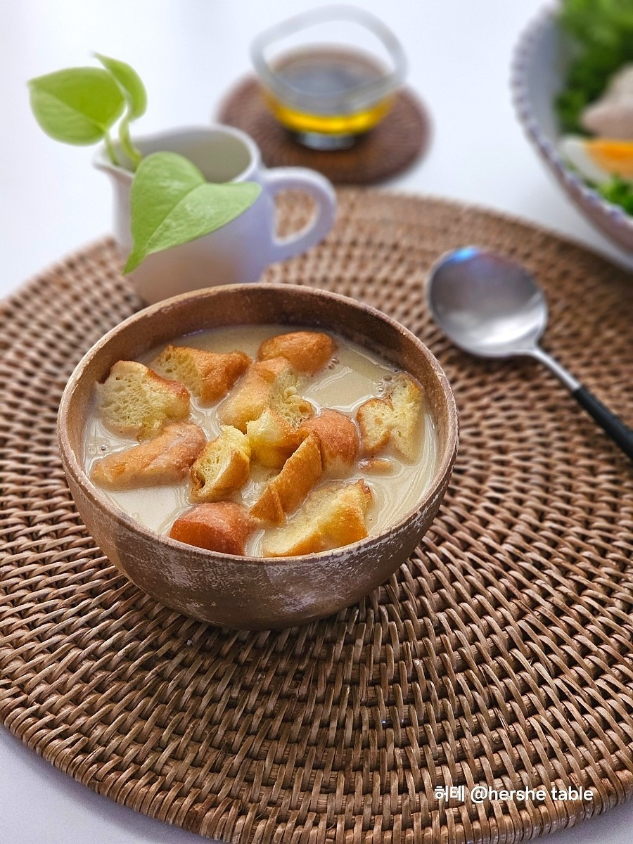 Terakhir, tambahkan donat kkwabaegi yang kenyal ke dalam kuah kedelai hangat. Potong donat menjadi bagian-bagian seukuran sekali gigit, sekitar 2-3 cm (sekitar 1 inci), dan aduk ke dalam bubur. Potongan donat akan menyerap sebagian kuah, membuatnya menjadi sangat lembut dan lezat.
