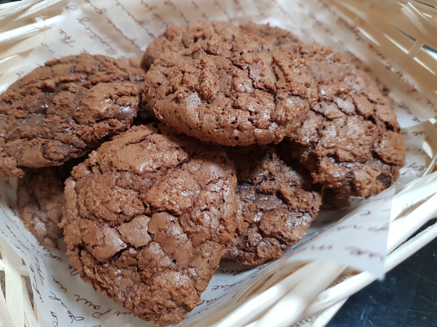 Setelah adonan dingin, ambil adonan secukupnya menggunakan sendok es krim atau sendok biasa, lalu letakkan di atas loyang yang sudah dilapisi kertas roti. Beri jarak antara adonan satu dengan yang lain. Panggang dalam oven yang sudah dipanaskan sebelumnya pada suhu 175°C selama kurang lebih 10 menit. Bagian pinggir kue seharusnya sudah mulai kokoh, namun bagian tengah masih terlihat sedikit lembek dan fudgy.