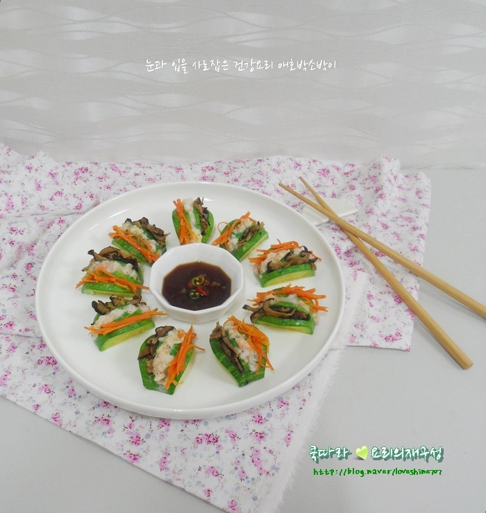 Ini adalah hidangan zukini kukus, sangat berbeda dari kimchi mentimun “sobagi” pada umumnya. Tampilannya yang cerah dan seperti bunga menjadikannya pusat perhatian yang sempurna untuk acara-acara spesial seperti peresmian rumah atau ulang tahun. Sayuran berwarna-warni dan udang gemuk bersatu untuk menciptakan pengalaman kuliner yang lezat secara visual dan memanjakan lidah.