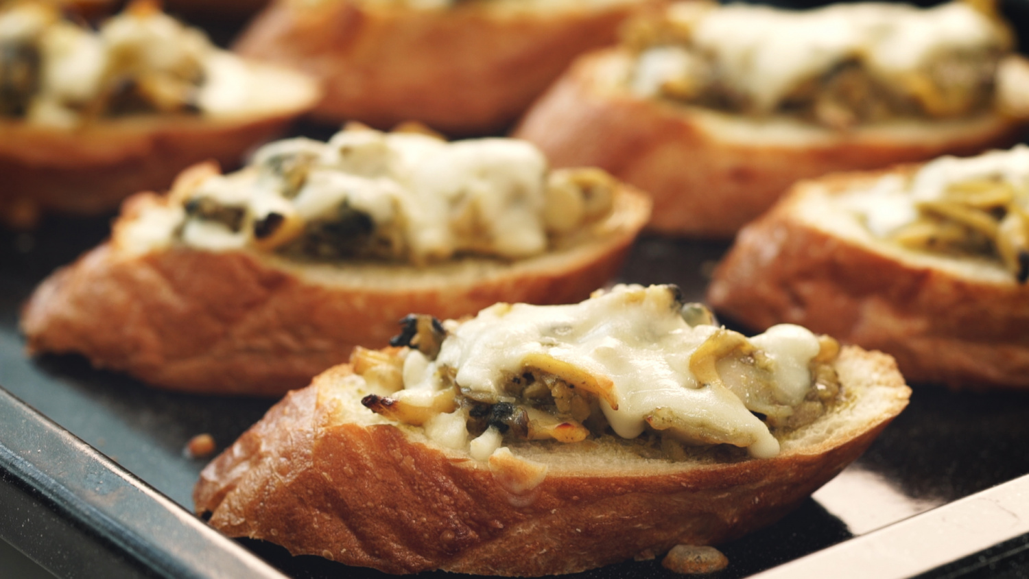 Oleskan lapisan tipis campuran kupas tuntas dan basil yang sudah ditumis ke setiap irisan baguette. Kemudian, tata daging kupas tuntas yang sudah ditumis di atasnya dengan menarik.