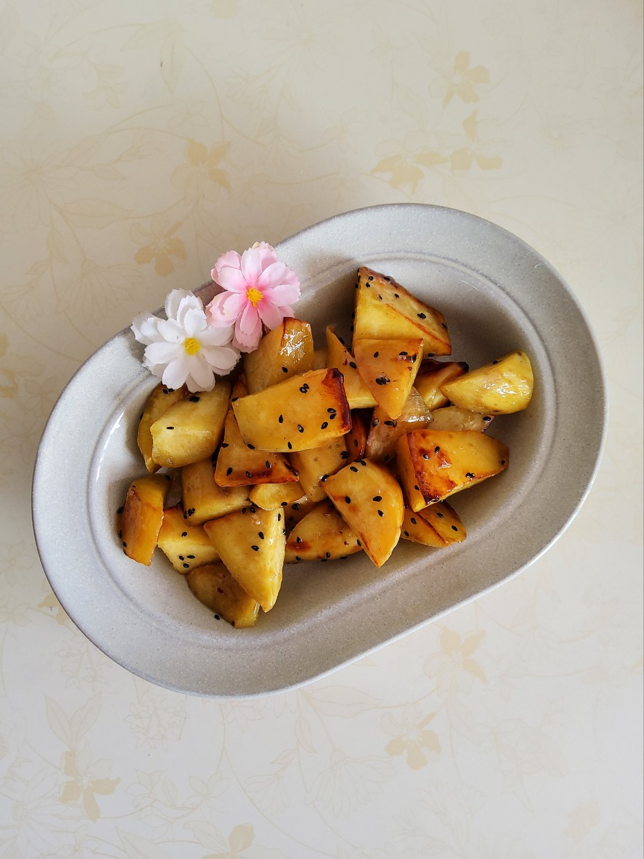 Terakhir, taburkan 1 sendok makan biji wijen hitam di atas ubi jalar yang sudah diglasir. Aduk perlahan untuk mendistribusikannya secara merata, menambahkan rasa gurih kacang dan sentuhan visual yang menarik.