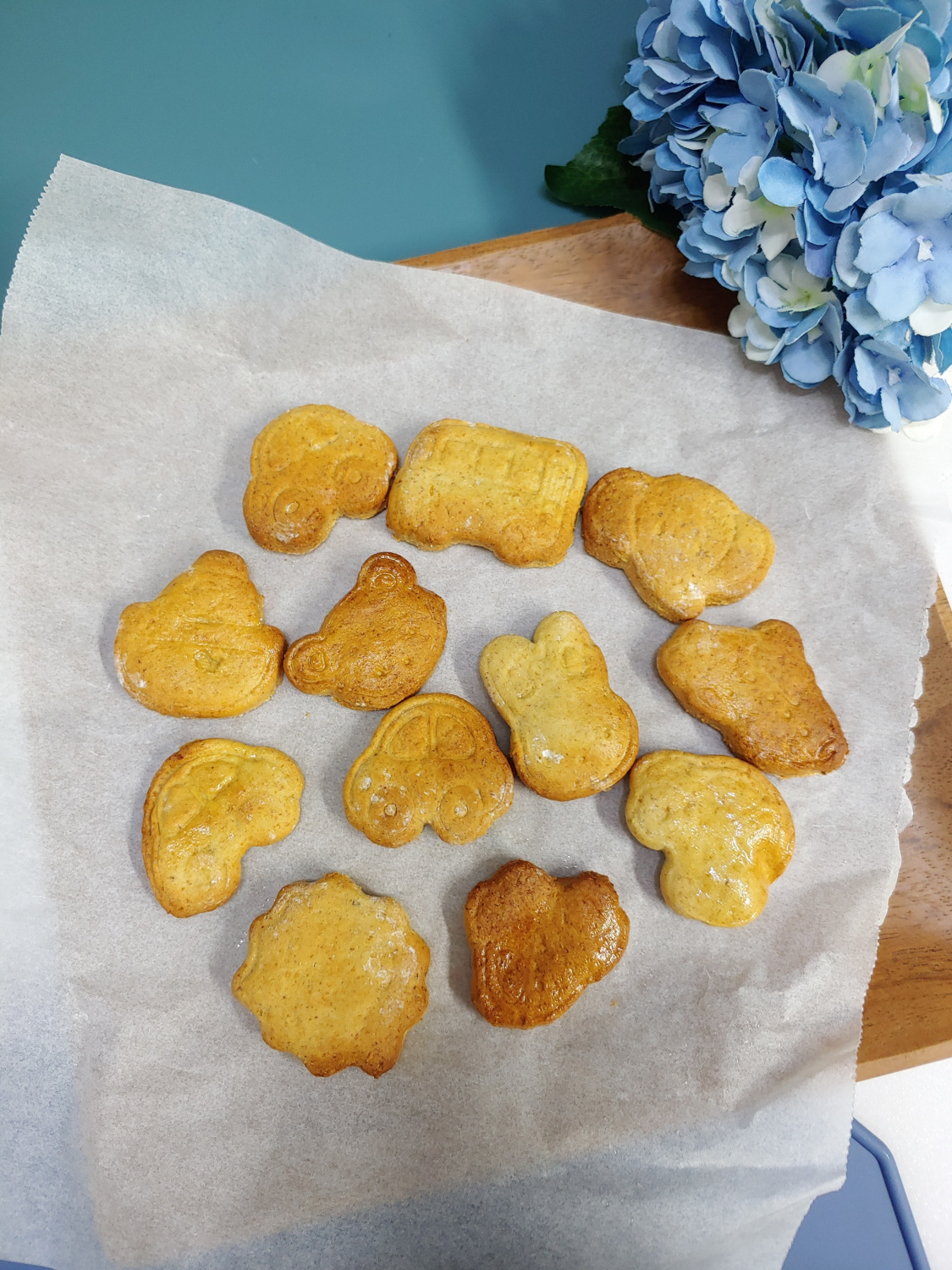 Kumpulkan sisa adonan yang belum terpakai, bungkus lagi, dan gilas kembali untuk mencetak kue lagi. Sisa adonan ini bisa disimpan di freezer untuk digunakan di lain waktu. (Karena sudah mendekati waktu tidur bayi saya, saya menggilas dan membekukan sisa adonan.) Susun kue yang sudah dibentuk di keranjang air fryer. Panggang dengan suhu 160°C (320°F) selama sekitar 15-20 menit. Waktu memanggang bisa bervariasi tergantung model air fryer Anda, jadi perhatikan kematangannya.