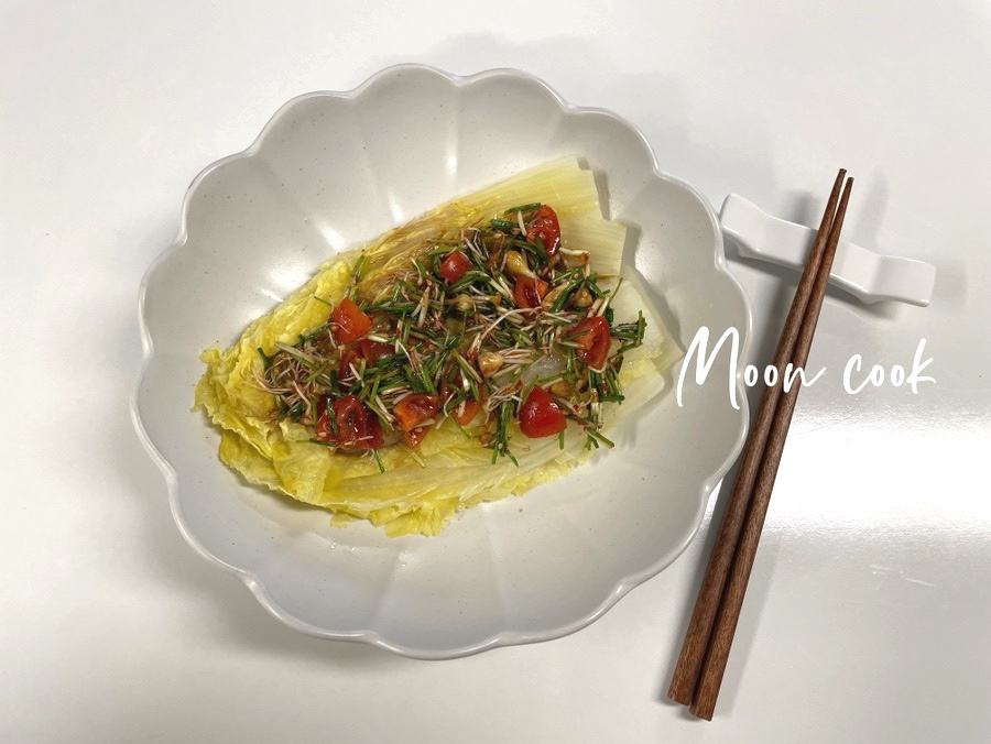 Tata kubis Tiongkok kukus di atas piring saji. Taburkan tomat ceri yang sudah dipotong secara merata di atas kubis. Ini akan menambah warna yang cantik.