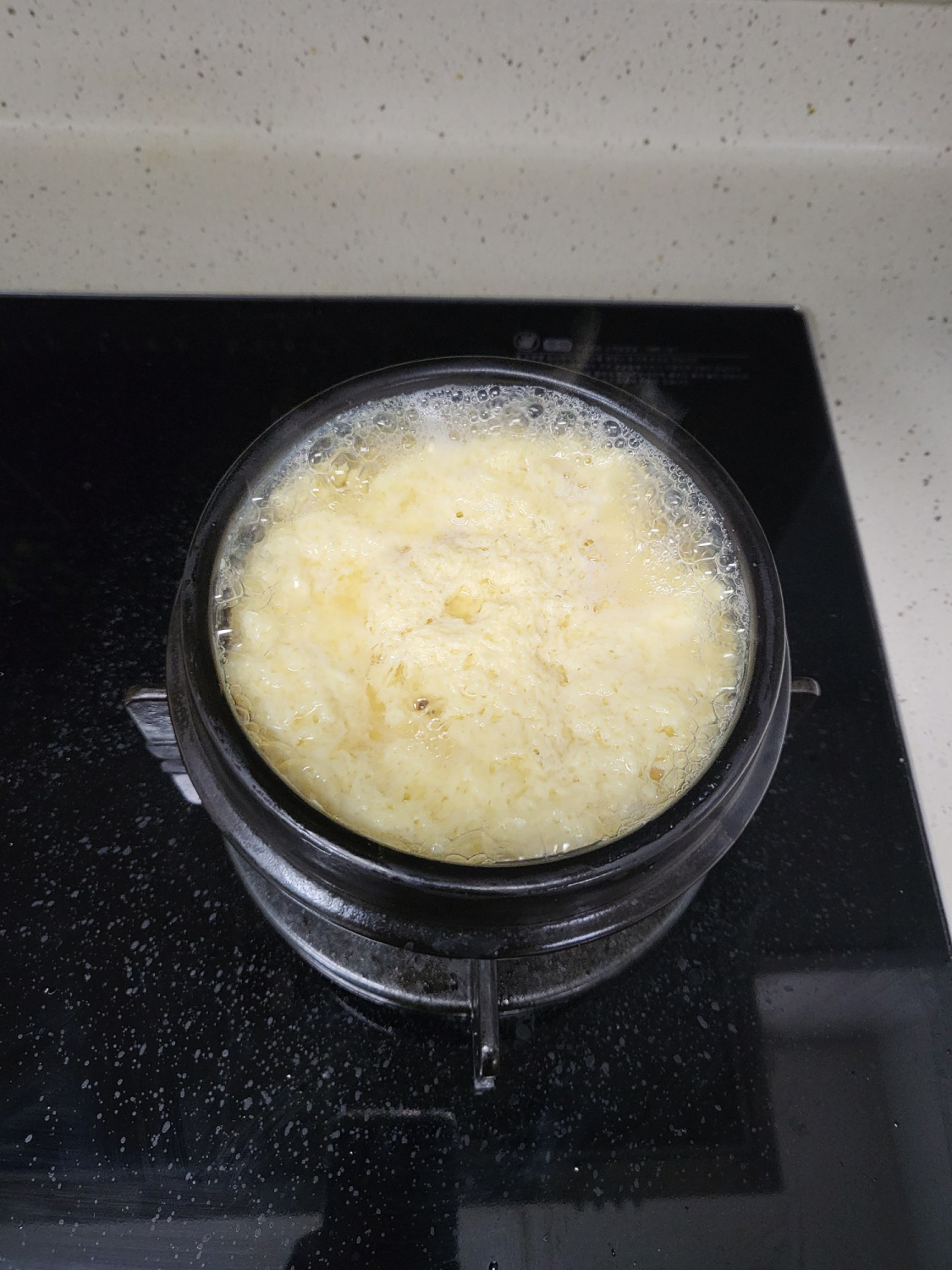 Tuang 250ml air ke dalam ttukbaegi (panci tanah liat Korea) atau panci biasa. Menggunakan ttukbaegi direkomendasikan karena kemampuan menahan panasnya yang sangat baik berkontribusi pada kukus telur yang sangat halus dan lembut.