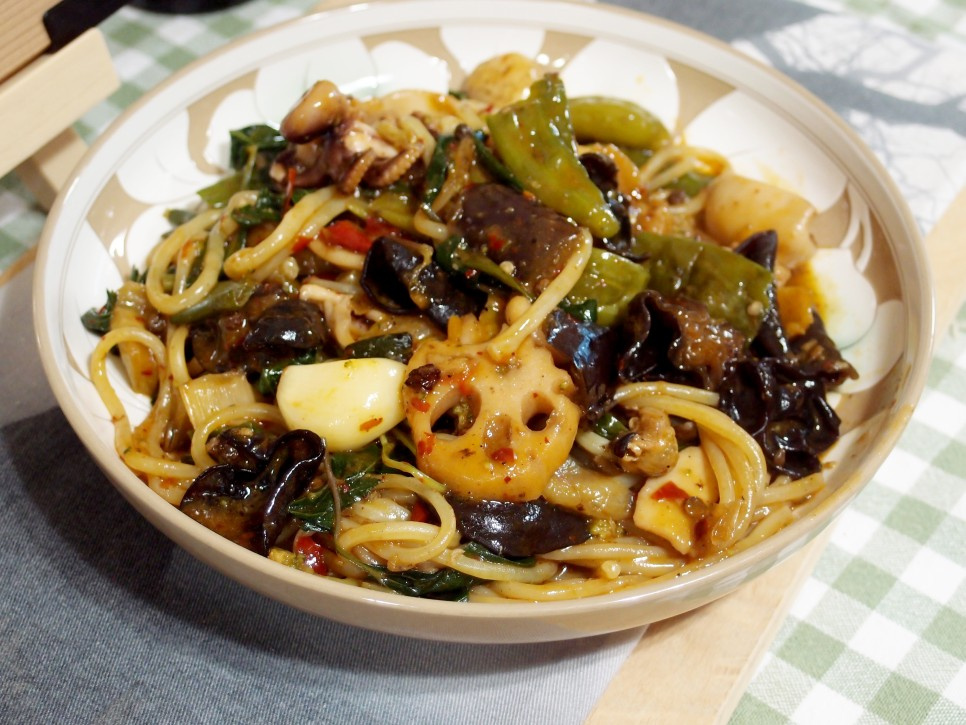 Panaskan minyak dalam wajan atau penggorengan besar. Masukkan jamur kuping, akar teratai, cabai (opsional), campuran sayuran beku, dan campuran seafood beku yang sudah disiapkan. Tumis dengan cepat hingga bahan-bahan setengah matang. Setelah sedikit empuk, tambahkan gula dan Shao Xing wine (atau sake) lalu tumis untuk memberikan rasa asap.