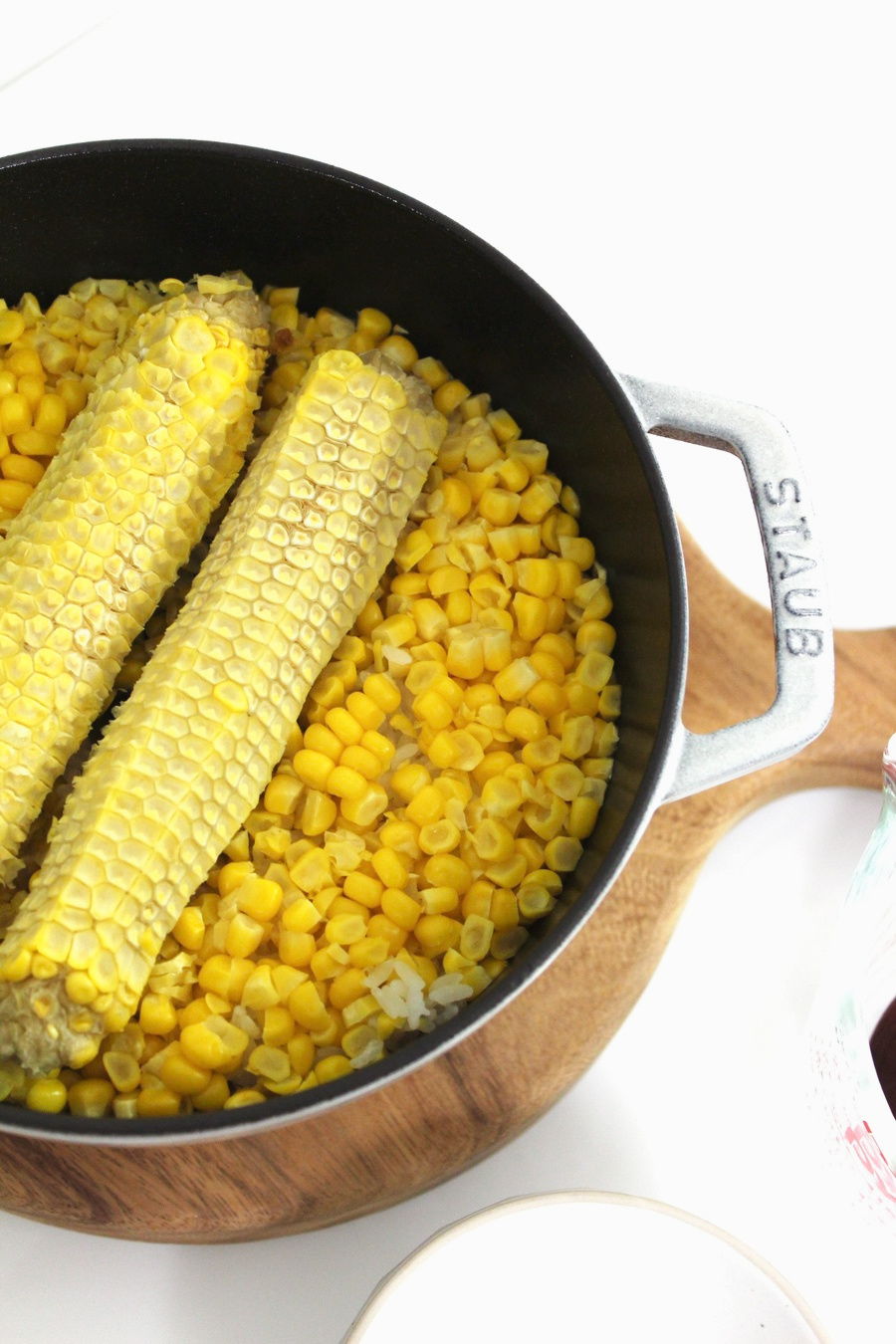 Tambahkan juga tongkol jagung ke dalam panci. Memasak dengan tongkol akan membantu meresapkan rasa manis jagung lebih banyak ke dalam nasi.