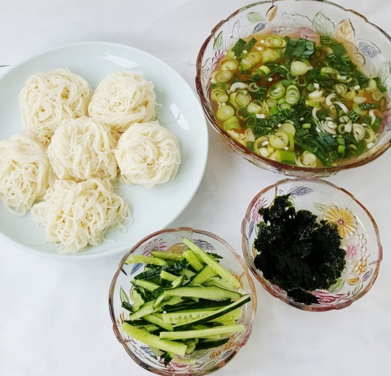 Rebus mi somen sesuai petunjuk kemasan untuk 2 porsi. Setelah matang, bilas hingga bersih di bawah air mengalir dingin untuk menghilangkan kelebihan pati. Tiriskan dengan baik tetapi biarkan sedikit lembap. Tata mi di piring besar atau mangkuk dengan cara memutar perlahan porsi kecil dengan jari Anda menjadi sajian yang rapi.