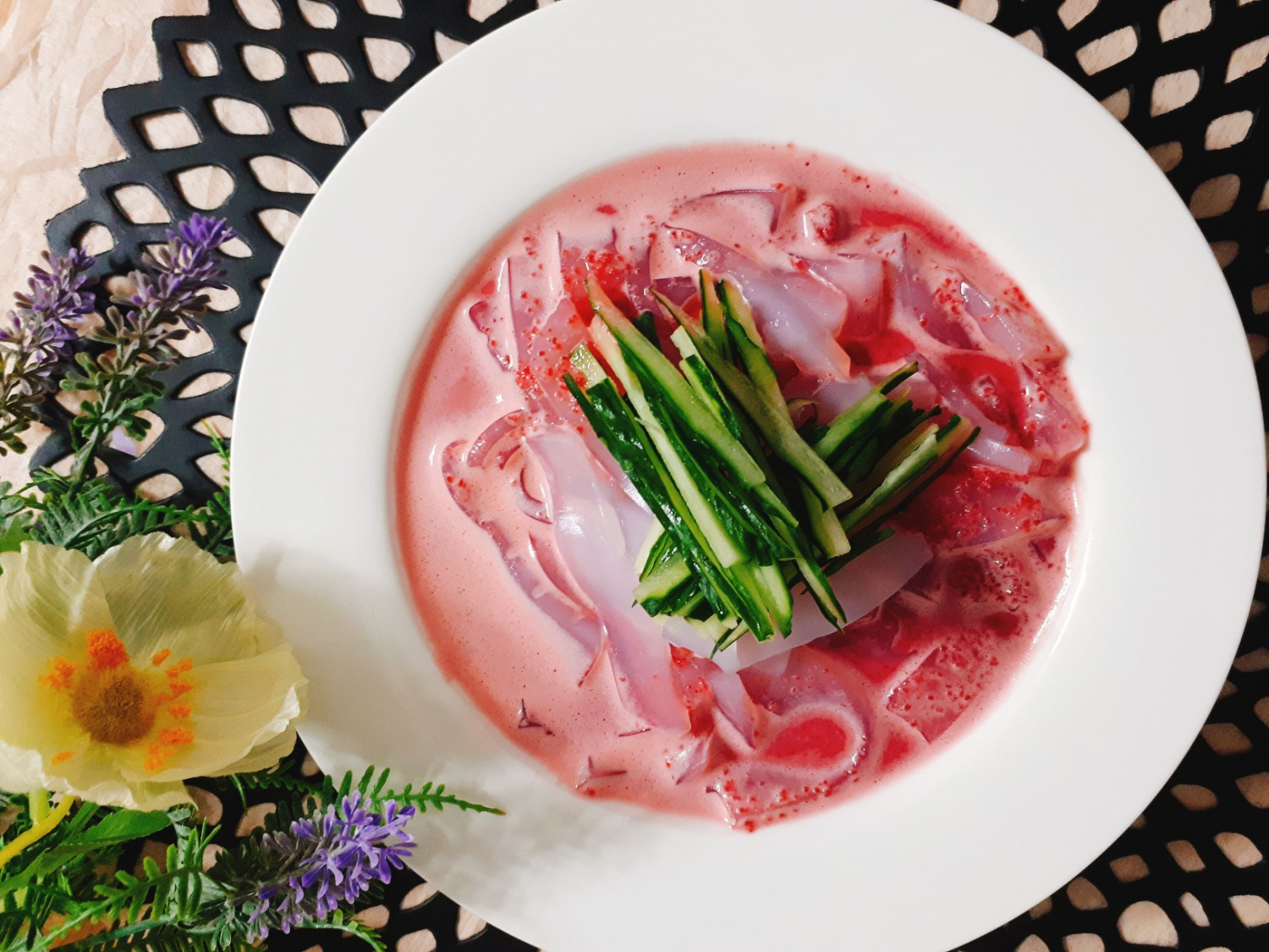 Terakhir, tuangkan perlahan susu kedelai dingin yang diinfuskan bit merah di atas tahu sutra dan mentimun. Anda akan mendapatkan Cheongpomuk Bit Kongguk yang memukau secara visual, lezat, lembut, gurih, dan menyegarkan. Hidangan sehat dan lezat yang sempurna!