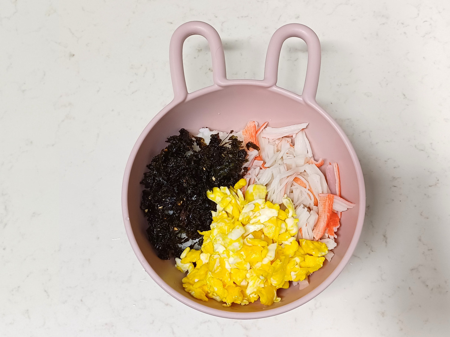 Terakhir, letakkan telur orak-arik lembut yang telah Anda siapkan sebelumnya di samping rumput laut serut di ruang kosong yang tersisa. Warna-warna cerah akan membuat hidangan terlihat menarik dan membangkitkan minat anak Anda.