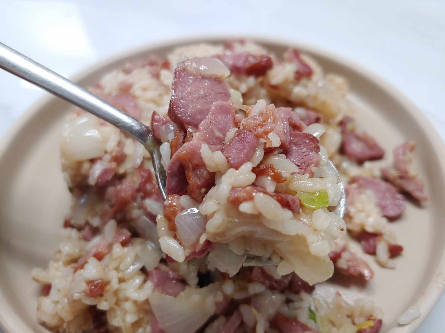 Demikian pula, potong bebek asap 300g sekecil mungkin dengan pisau. Jika potongan bebek asap terlalu besar, bisa terasa terpisah dari nasi, jadi usahakan potong seukuran butiran nasi. Segera masukkan bebek asap yang sudah dipotong ke dalam wajan. Minyak dari bebek asap sendiri sudah cukup banyak keluar, jadi tidak perlu menambahkan minyak goreng tambahan sama sekali.