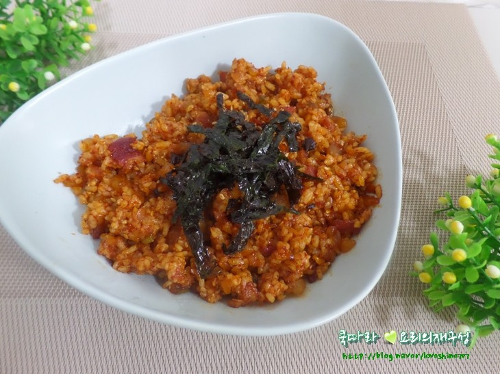 Sajikan nasi goreng hangat dalam mangkuk. Untuk tambahan rasa dan tekstur, taburkan sedikit nori cincang di atasnya. Nikmati hidangan solo Anda yang mengenyangkan dan beraroma dengan nasi goreng lobak ayam pedas manis ini!
