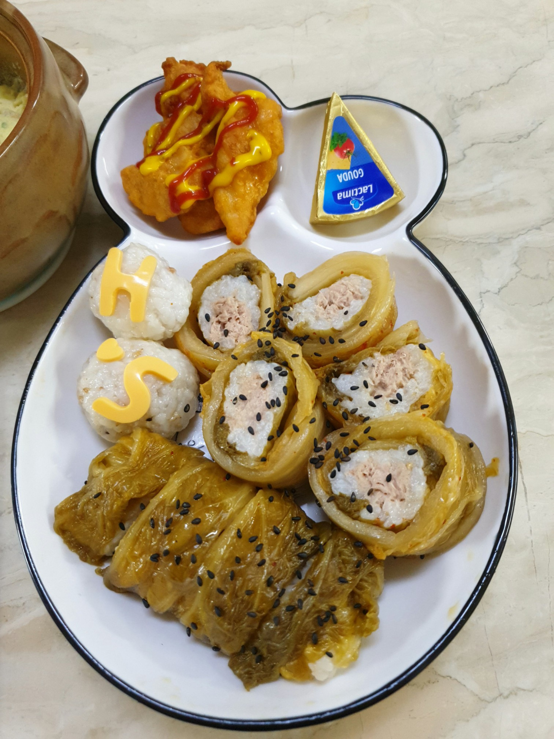 Sebarkan nasi yang sudah dibumbui tipis di atas lembaran kimchi tua yang sudah disiapkan. Letakkan isian tuna mayo di tengah nasi membentuk garis memanjang. Berhati-hatilah agar lapisan nasi tidak terlalu tebal, karena ini dapat menyulitkan saat menggulung.