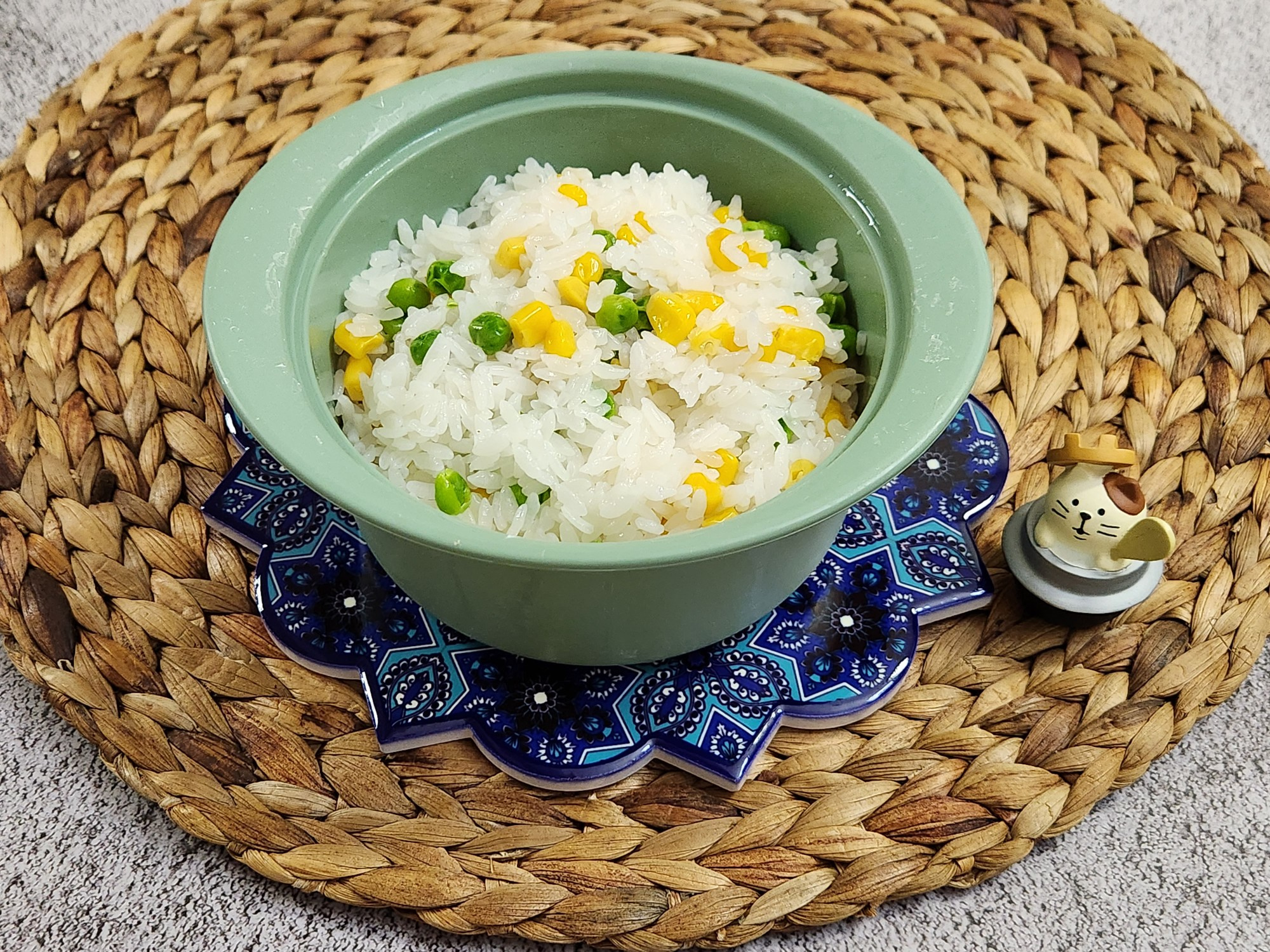 Hasilnya adalah semangkuk nasi yang sangat mengkilap dan menggugah selera, mirip dengan nasi yang baru dimasak. Rasa manis tambahan dari jagung dan kacang polong membuatnya semakin lezat.