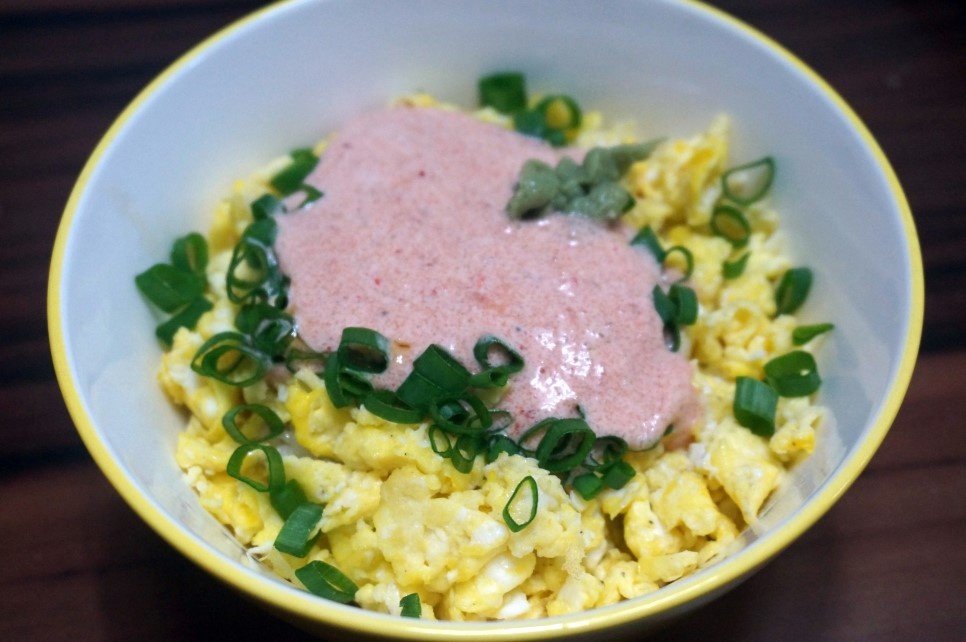 Taburkan irisan daun bawang di atas telur sebagai garnish segar, lalu tuangkan saus mentaiko mayo yang sudah disiapkan dengan melimpah di atas semuanya. Nasi Siram Mentaiko Mayo Anda yang lezat siap disajikan!