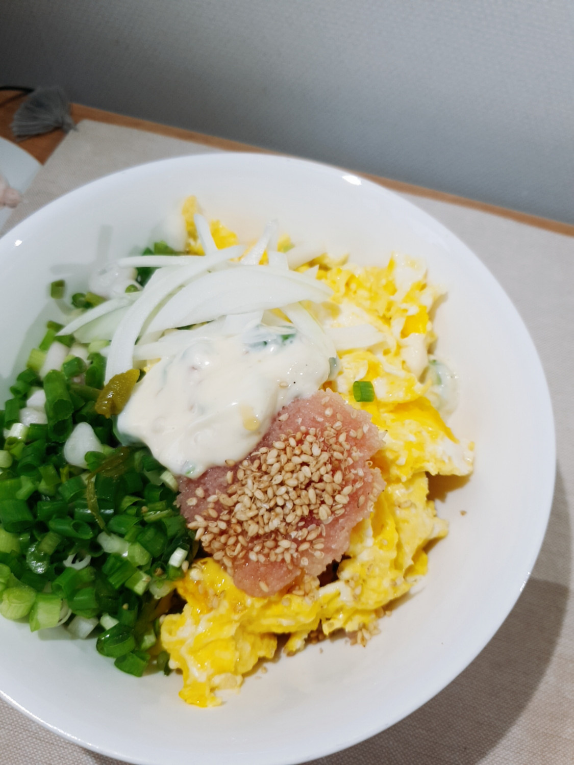 Akhirnya, waktu untuk menata! Tata nasi hangat dengan indah di dalam mangkuk. Di atasnya, letakkan setengah dari daun bawang yang sudah disiapkan dan telur orak-arik yang lembut. Lalu, tambahkan satu sendok makan telur ikan pollack siap pakai yang sudah disiapkan. Terakhir, tuangkan saus mayo telur ikan pollack pedas yang sudah dibuat secara menarik di atasnya, dan nasi Anda yang menggugah selera pun siap.