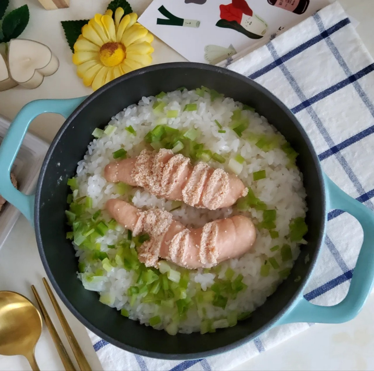 Cuci dan potong halus daun bawang. Ketika nasi hampir selesai dimasak, buka tutup rice cooker dan taburkan daun bawang cincang secara merata di atas Mentaiko. Aroma segar daun bawang akan menambah daya tarik hidangan ini.