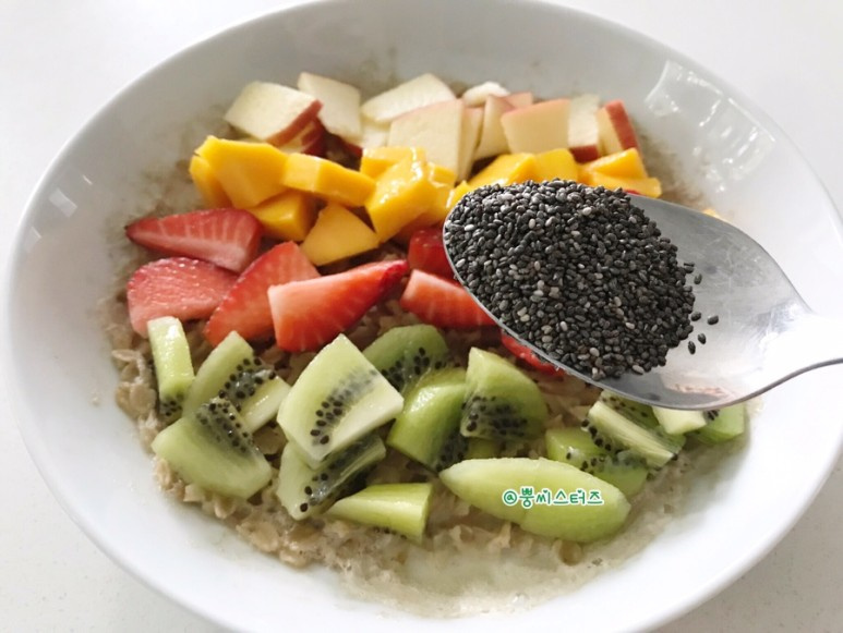 Terakhir, taburkan 1/2 sendok makan biji chia di atasnya. Biji chia kaya akan asam lemak omega-3 dan serat, menjadikannya tambahan yang sehat.