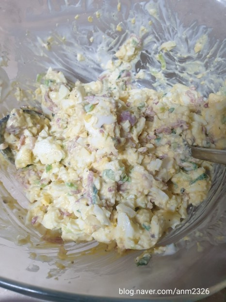 Haluskan Telur dan Campurkan: Masukkan telur rebus yang sudah dikupas ke dalam mangkuk pencampur. Gunakan garpu atau penghalus kentang untuk menghaluskan telur secara kasar. Hindari menghaluskannya hingga menjadi pasta halus; membiarkan beberapa potongan akan memberikan tekstur yang lebih baik. Tambahkan bacon dan daun bawang yang sudah dimasak ke dalam telur yang dihaluskan. Kemudian, tambahkan mayones secukupnya. Campurkan semuanya hingga tercampur rata.