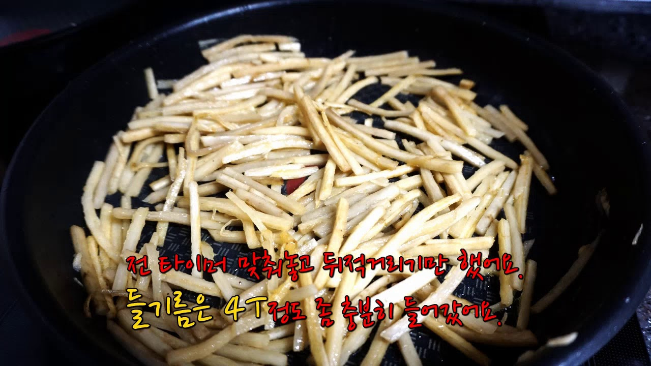 Panaskan wajan dengan api sedang, tambahkan minyak perilla (atau minyak wijen) secukupnya. Masukkan akar burdock yang sudah disiapkan, lalu tumis dengan api kecil selama 15 menit. Sangat penting untuk menjaga api tetap kecil selama proses ini. Memasak perlahan akan mengurangi rasa sedikit pahit khas burdock dan mengembangkan teksturnya yang lembut. Setelah 15 menit, Anda akan melihat akar burdock menjadi lunak dan volumenya berkurang.