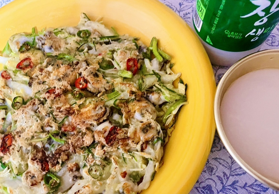 Beberapa hari terakhir ini hujan musim semi terus-menerus turun, membuat cuaca terasa sedikit dingin, seperti ritual peralihan menuju musim semi. Setelah hujan musim semi, sebentar lagi kita akan melihat tunas dan kuncup bunga bermunculan dengan semangat, penuh kelembapan dan energi musim semi. Sudah menjadi kebiasaan saya untuk mendambakan pancake di hari-hari hujan musim semi. Ada yang bilang aroma kaya dan gurih dari pancake yang baru digoreng bertahan lebih lama dan tercium lebih kuat di hari yang mendung karena udaranya lebih rendah dan padat, merangsang indra penciuman dan nafsu makan kita. Saya membeli sebungkus tiram, mencincang sayuran musim semi minari dan dallae yang ada di kulkas, menambahkan sedikit sawi putih yang diiris, dan membuat pancake tiram yang lezat ini. Saya memasangkannya dengan segelas makgeolli untuk kombinasi yang sempurna. Saya menyajikan pancake tiram yang gurih, menuangkan segelas makgeolli, dan menyantapnya untuk makan malam, menggantikan makanan biasa. Satu pancake, penuh dengan esensi sayuran musim semi, digoreng hingga renyah keemasan, ditemani makgeolli – cukup untuk membuat mabuk oleh rasa musim semi dan hujan yang lembut. Musim semi memang sedang dalam perjalanan~ ^^