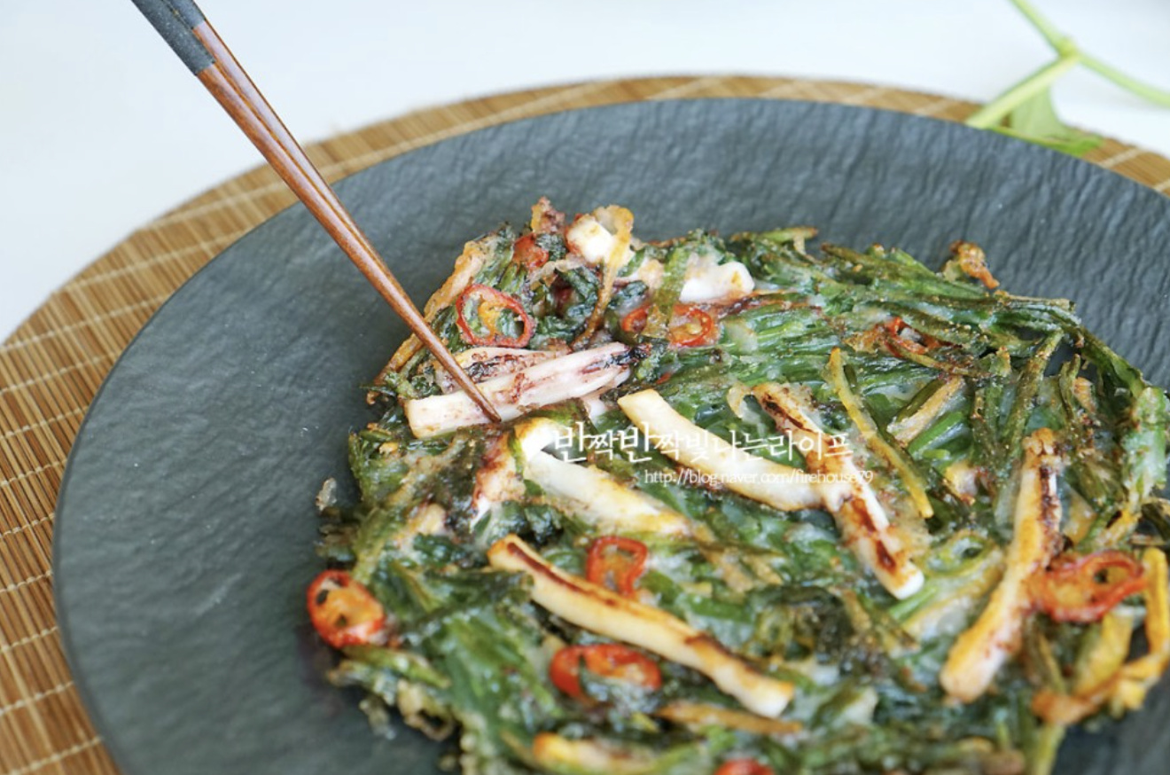 Bagaimana dengan pancake daun kucai renyah yang dipadukan dengan cumi kenyal, lengkap dengan aroma menggoda dari wajan panas? Menggorengnya dengan minyak yang melimpah akan memastikan pancake tetap renyah bahkan saat dingin. Pancake ini sangat cocok dinikmati bersama makgeolli (anggur beras Korea) atau minuman favorit Anda. Rasakan sentuhan keajaiban kuliner rumahan!