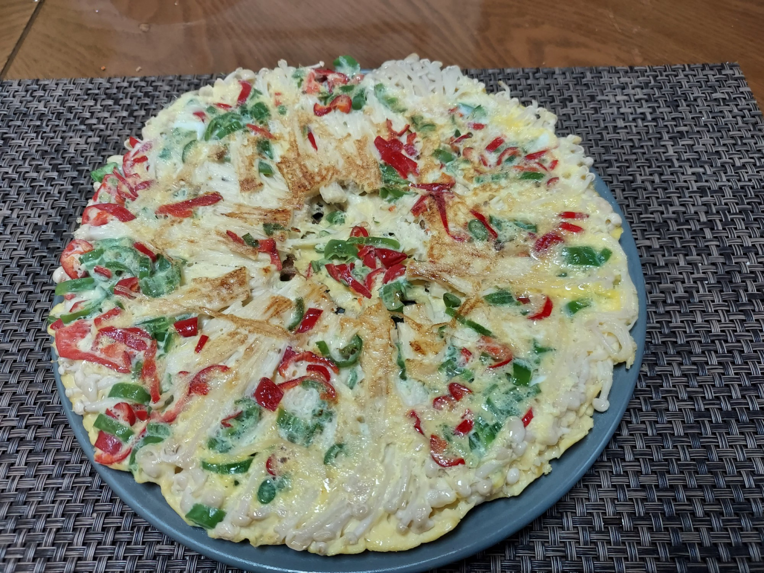 Pindahkan Pancake Jamur Enoki yang matang sempurna ke piring saji dengan hati-hati. Lihatlah Pancake Jamur Enoki Altoran yang menggugah selera – siap disajikan!
