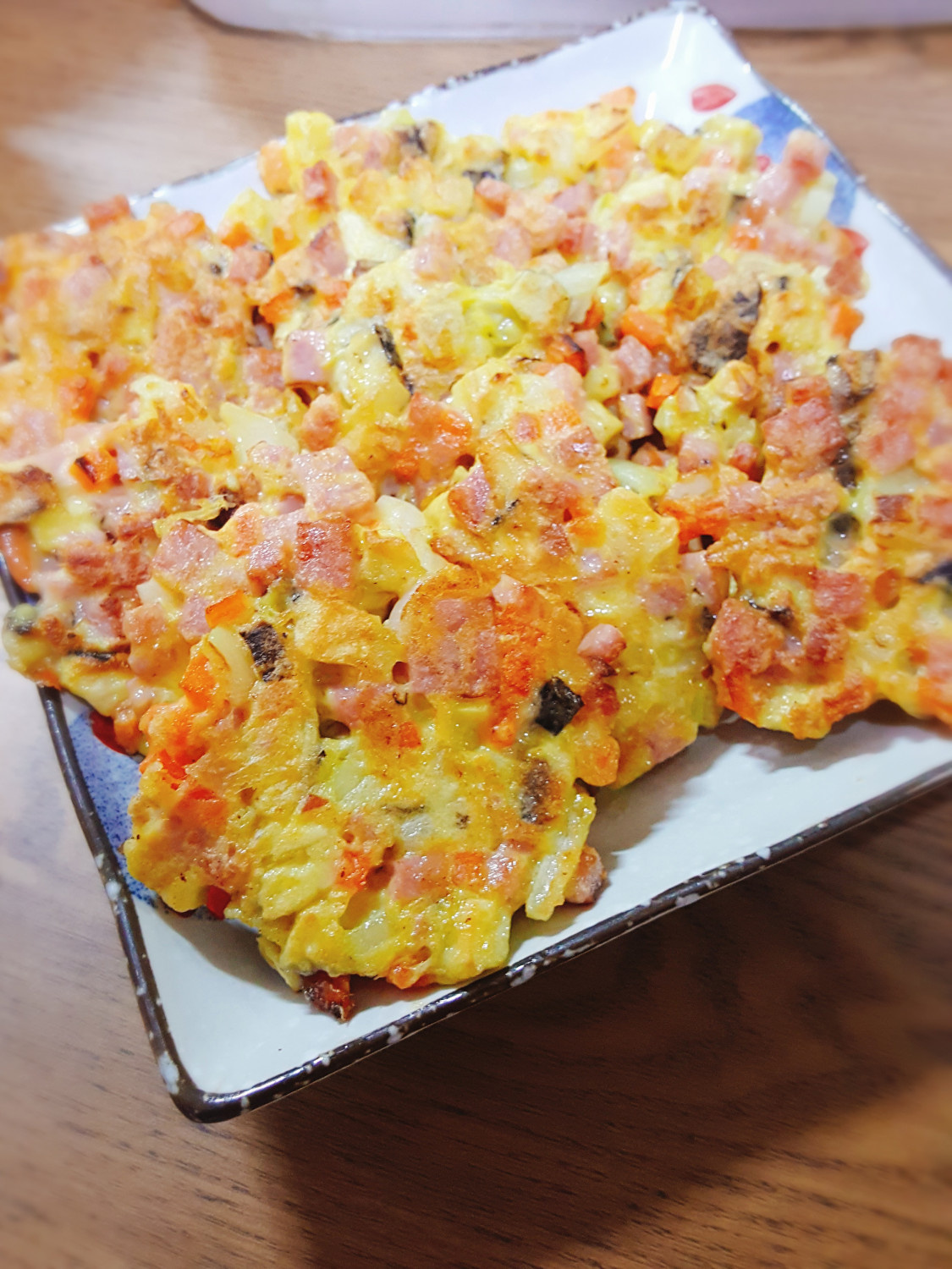 Dalam mangkuk besar, campurkan jamur Songhwa cincang, bawang bombay cincang, wortel cincang, dan daging asap cincang. Pecahkan 3 butir telur segar ke dalamnya, tambahkan 2 sejumput garam dan sejumput lada hitam untuk bumbu. Terakhir, masukkan 2 sendok makan tepung tempura munjung untuk mendapatkan kekentalan adonan yang pas.