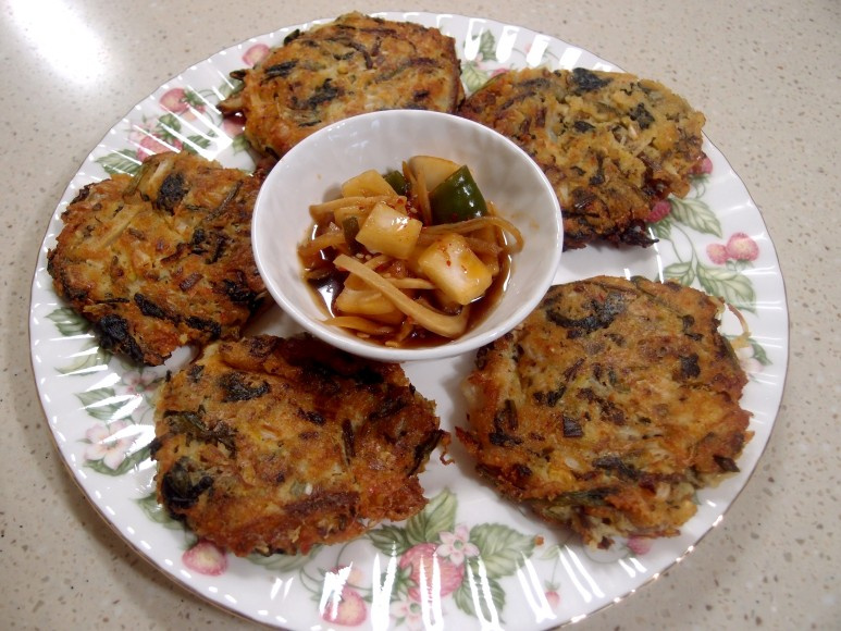 Pancake berwarna cokelat keemasan yang bagus di kedua sisinya. Anda bisa mencium aroma samar kimchi saat digoreng dan bahkan setelah matang. Menambahkan namu ekstra membuat pancake menjadi sangat gemuk dan tebal. Saya tidak sabar untuk mencicipi pancake kacang hijau yang diberi rasa kimchi ini.